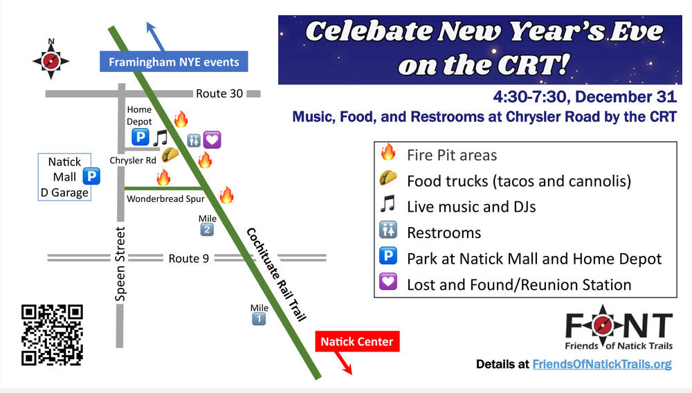 New this year: Natick’s Cochituate Rail Trail New Year’s Eve celebration will take place just over the Rte. 30 pedestrian bridge. That will make for one long trail party, so attendees can easily enjoy the festivities in both Framingham and Natick. (Natick’s New Year’s Eve event took place farther down the trail in past years.) See maps below.